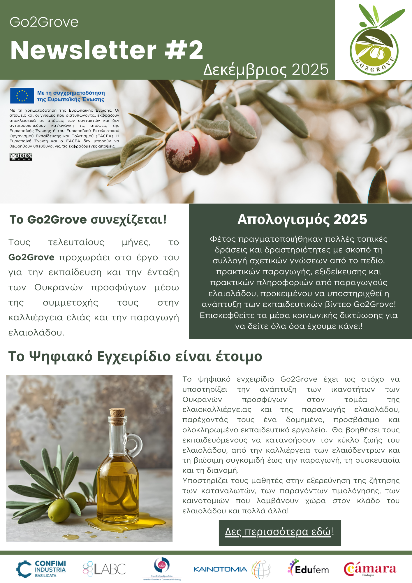 - Τον απολογισμό του 2025, μέσα από τοπικές δράσεις και πρακτικές δραστηριότητες, καθώς και τη συλλογή εξειδικευμένης γνώσης από παραγωγούς ελαιολάδου, που συνέβαλαν άμεσα στην ανάπτυξη των εκπαιδευτικών βίντεο του Go2Grove.